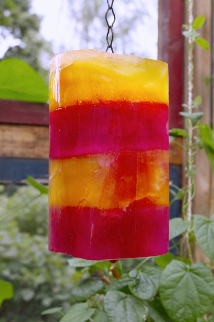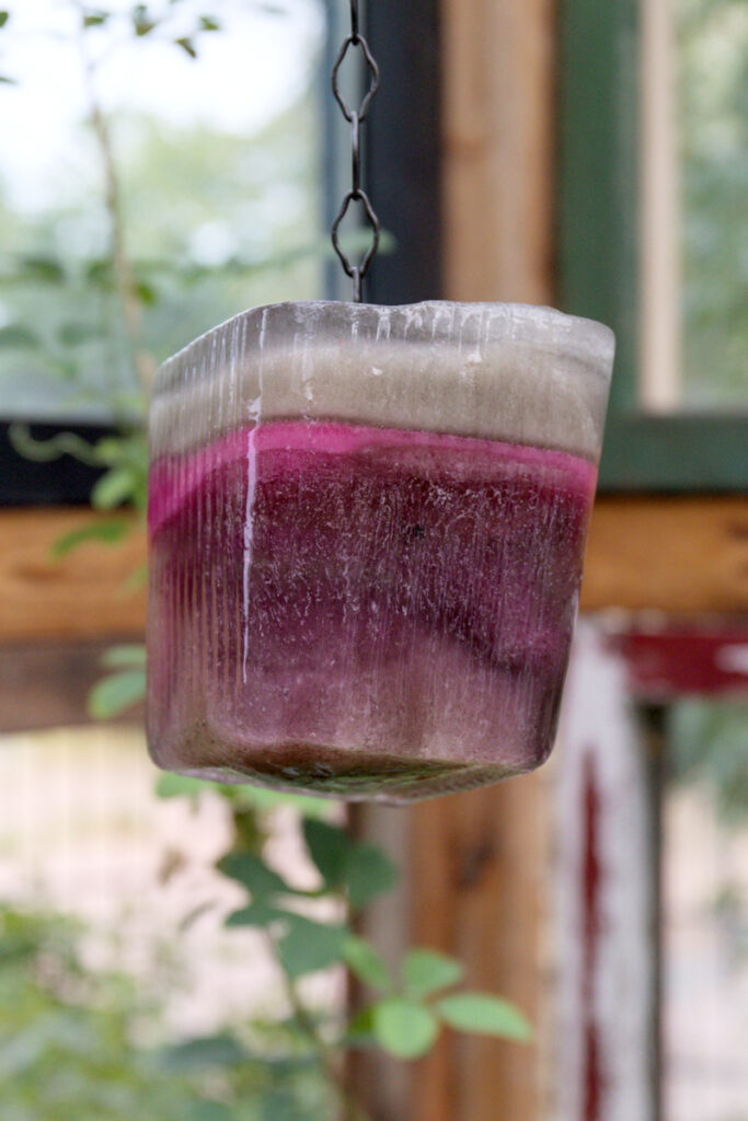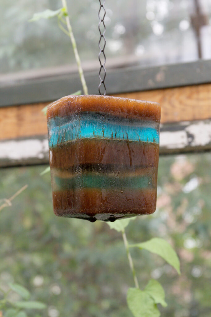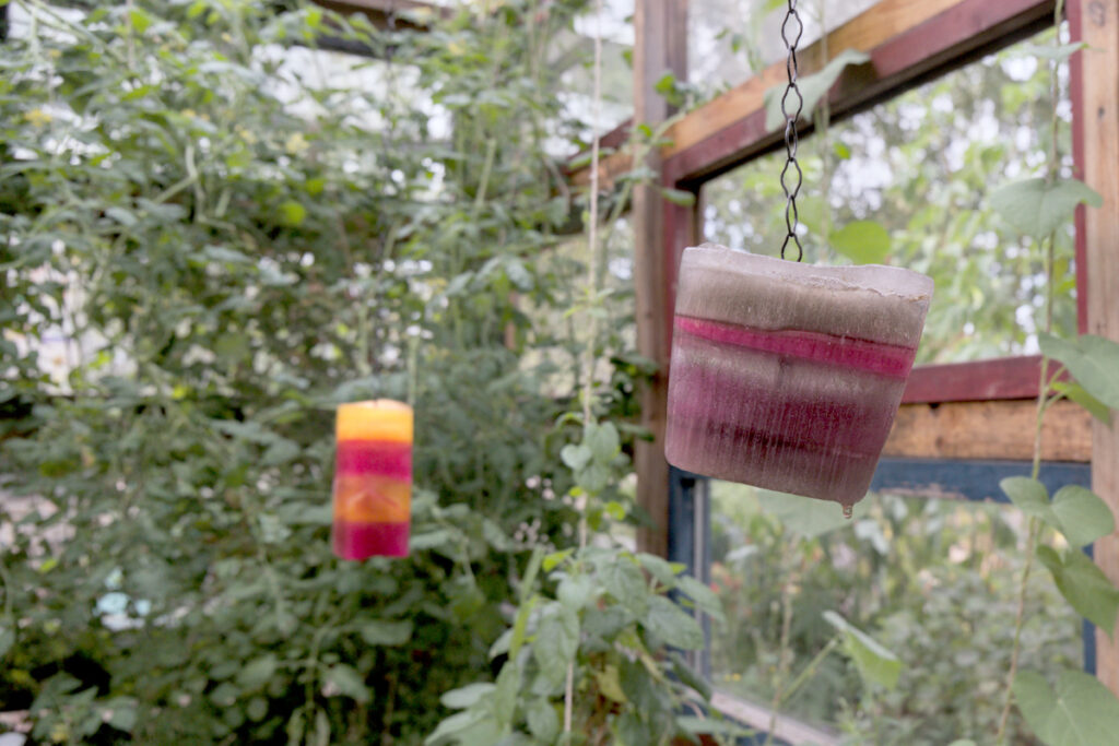 Lohiaita’s artistic contribution was a site-specific installation Drip Feed, which consisted of three ice sculptures hung from the greenhouse ceiling, melting slowly into the soil below. The sculptures were dyed with turmeric, beetroot, nettle, coffee and blue food dye.